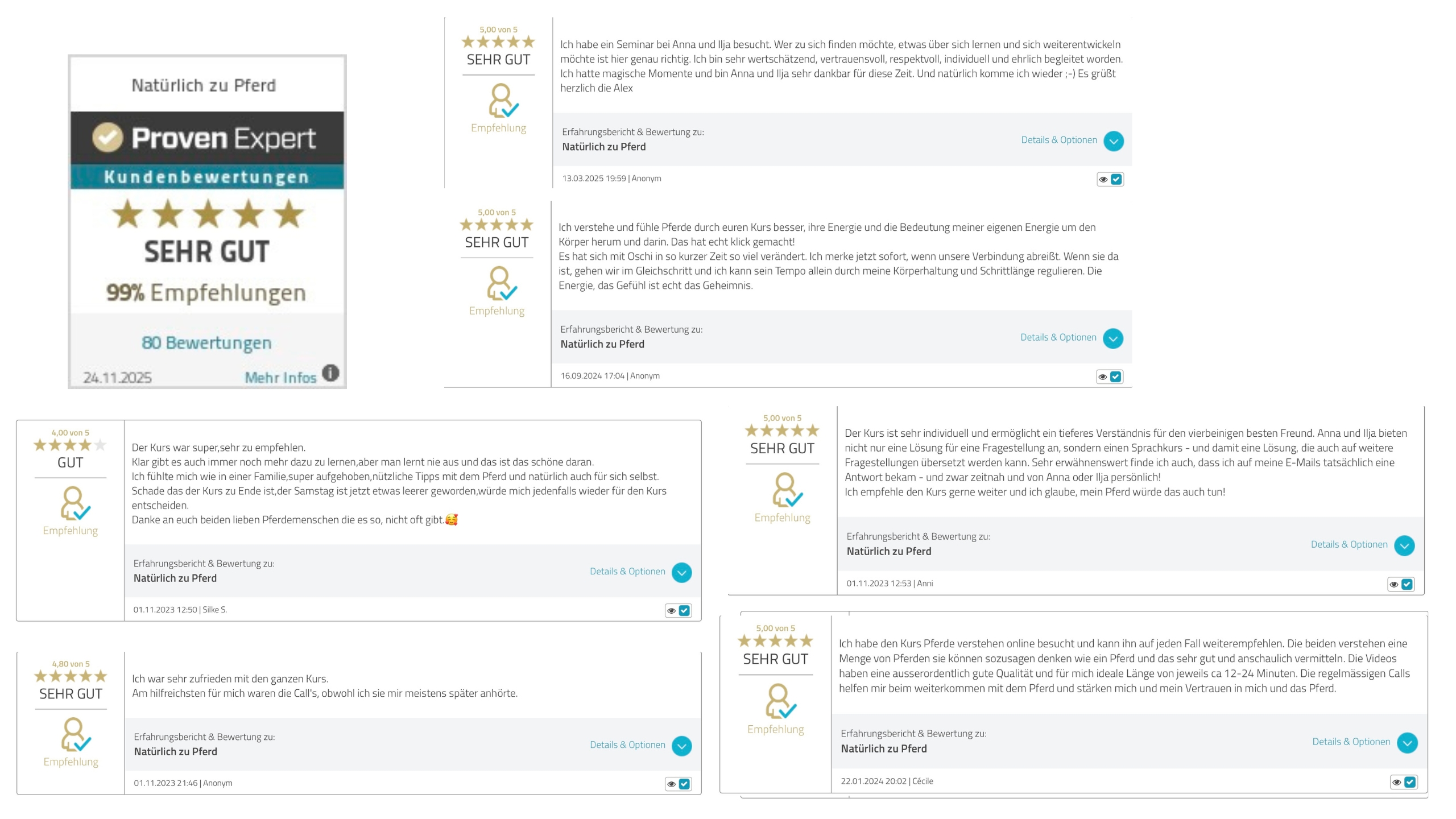 In diesen 8 Stunden lernst Du unser Vertrauens-orientiertes Pferdecoaching© kennen – einen völlig anderen Ansatz, der auf Verstehen statt Kontrollieren setzt. Anna und Ilja führen Dich Schritt für Schritt durch die wichtigsten Prinzipien, zeigen Dir konkrete Übungen und geben Dir die mentale Klarheit, die Du brauchst, um endlich entspannt und selbstbewusst zu Deinem Pferd zu gehen.